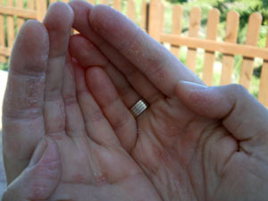 Дисгидротическая экзема. Этот вид экземы отличается от предыдущих тем, что ее очаги проявляются на подошвах и ладонях человека. В связи с достаточно толстым роговым слоем эпидермиса в этих частях тела, начальная стадия, на которой появляются экземные высыпания, выражена достаточно слабо. С течением времени пузырьки начинают вскрываться, на их месте образуются эрозии, также они могут подсыхать, превращаясь в гнойные корки. Часто они сливаются в крупные пузырьки. В случае отказа от лечения, очаги распространяются на другие участки тела, и дисгидротическая экзема переходит в экзему идиопатическую.