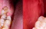 - Образование «капюшона» – в связи с недостаточным местом для роста между 7-м зубом и углом нижней челюсти, при прорезывании зуба мудрости образуется бугор из тканей десны, который воспаляется и болит. Лечение в этом случае заключается в хирургическом иссечении «капюшона».